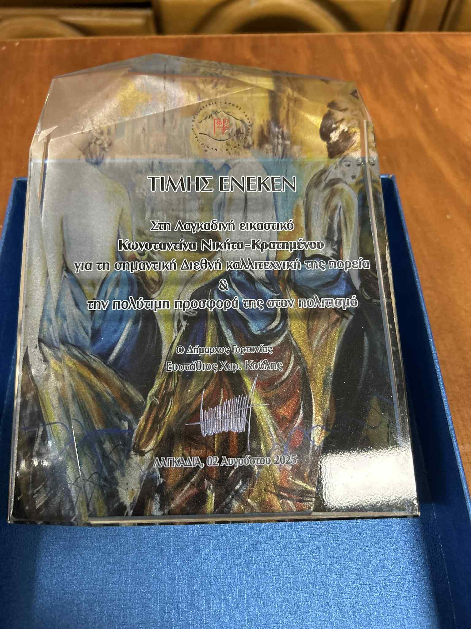 Από την πλευρά της, η εικαστικός Κωνσταντίνα Νικήτα-Κρατημένου, στον χαιρετισμό της αναφέρθηκε στον τόπο καταγωγής της, τα Λαγκάδια, και την βαθιά συναισθηματική σύνδεση που διατηρεί με τον τόπο: «καθώς εδώ βρίσκονται οι ρίζες μου, αλλά και η μνήμη των γονιών μου, τους οποίους απόψε αισθάνομαι ζωντανούς, παρόντες και συνοδοιπόρους, παρά την απουσία τους από τη ζωή», ανέφερε με συγκίνηση.