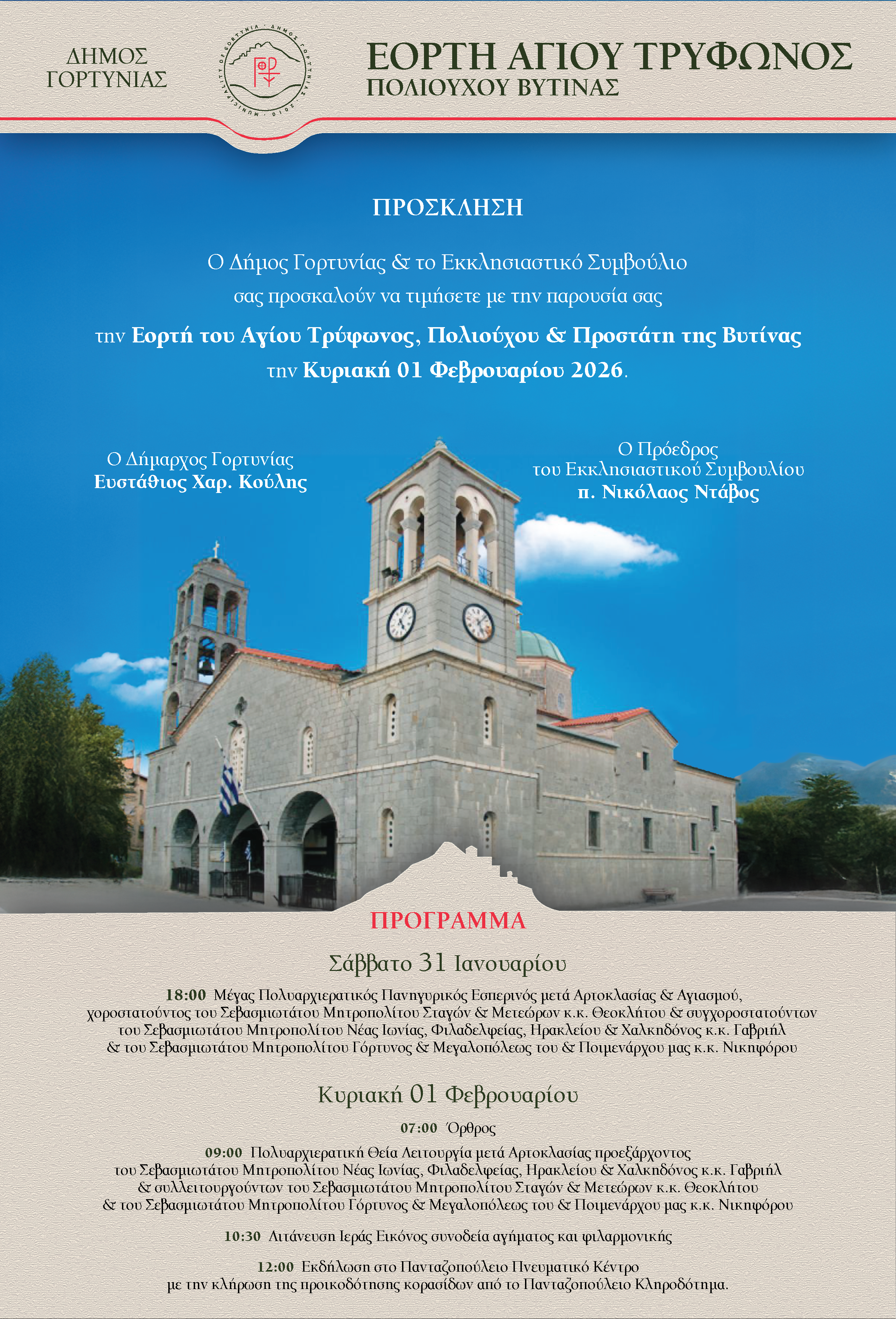 Ο Δήμος Γορτυνίας και το Εκκλησιαστικό Συμβούλιο, σας προσκαλούν να τιμήσετε με την παρουσία σας την εορτή του Αγίου Τρύφωνος, Πολιούχου και Προστάτη της Βυτίνας, την Κυριακή 1 Φεβρουαρίου 2026.