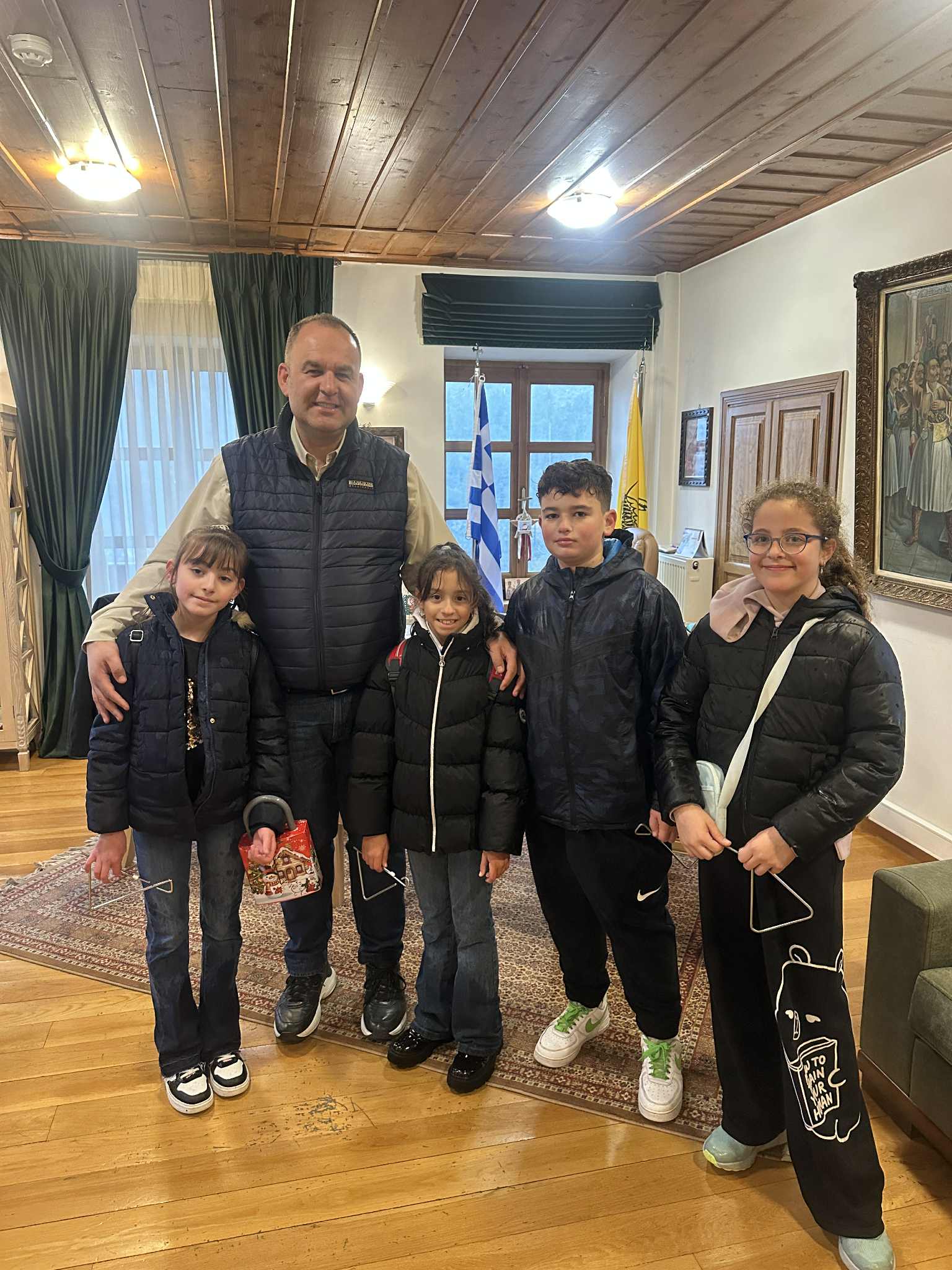Η ατμόσφαιρα φορτίστηκε συγκινησιακά όταν οι μικροί μας «αγγελιοφόροι» της χαράς αντάλλαξαν ευχές με τον Δήμαρχο, ο οποίος τους υποδέχθηκε με πατρική στοργή, προσφέροντας παραδοσιακά κεράσματα και αναμνηστικά δώρα.