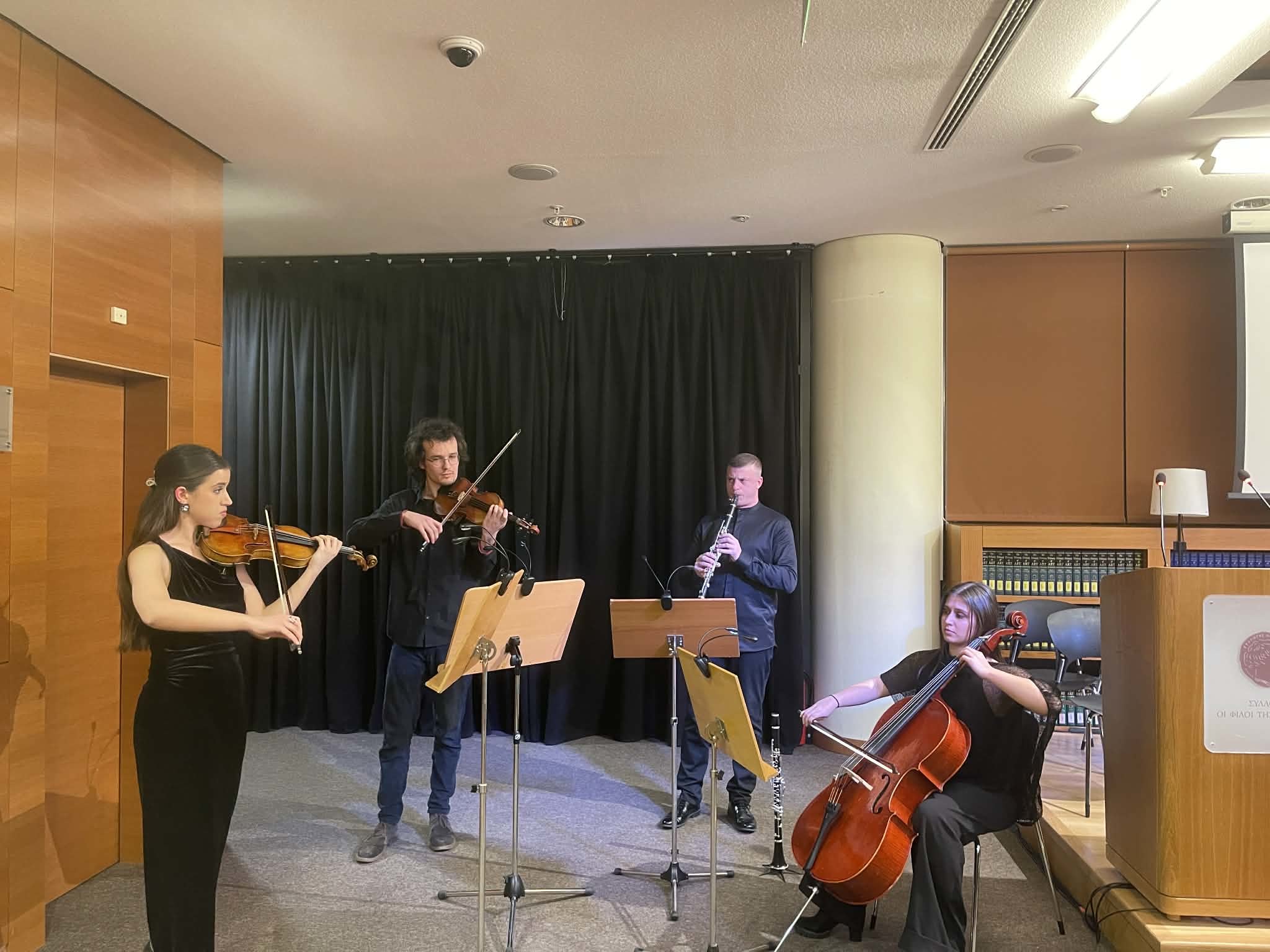 Οι παρευρισκόμενοι παρακολούθησαν, στο μουσικό μέρος της εκδήλωσης, συναυλία με έργα Θεοδωράκη από το σύνολο δωματίου της Camerata Junior.