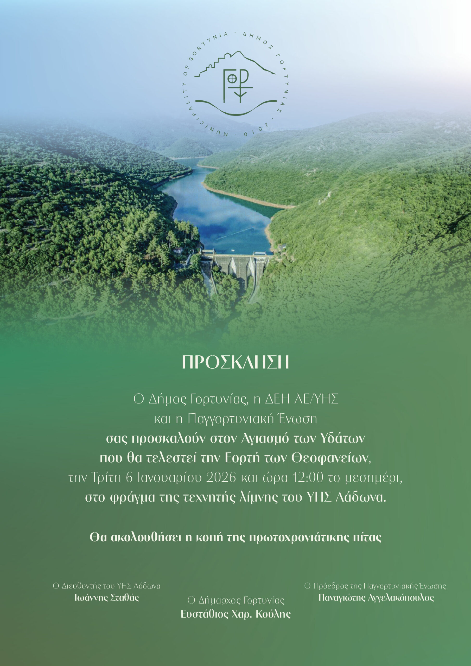 Ο Δήμος Γορτυνίας, η ΔΕΗ ΑΕ/ΥΗΣ και η Παγγορτυνιακή Ένωση σας προσκαλούν στον Αγιασμό των Υδάτων που θα τελεστεί την Εορτή των Θεοφανείων, την Τρίτη 6 Ιανουαρίου και ώρα 12:00 το μεσημέρι, στο φράγμα της τεχνητής λίμνης του Υδροηλεκτρικού Σταθμού Λάδωνα.
