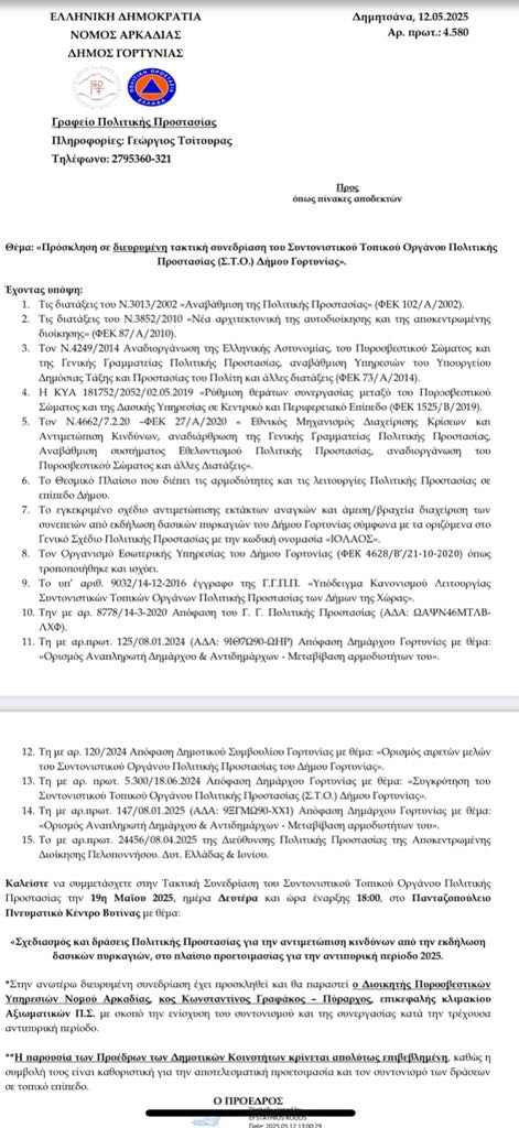 Διευρυμένη Τακτική Συνεδρίαση του Συντονιστικού Τοπικού Οργάνου Πολιτικής Προστασίας με θέμα: «Σχεδιασμός και δράσεις Πολιτικής Προστασίας για την αντιμετώπιση κινδύνων από την εκδήλωση δασικών πυρκαγιών», στο πλαίσιο προετοιμασίας για την αντιπυρική περίοδο 2025, συγκαλεί ο Δήμος Γορτυνίας την Δευτέρα 19 Μαΐου 2025, στις 18:00 μ.μ., στο Πανταζοπούλειο Πνευματικό Κέντρο Βυτίνας.
