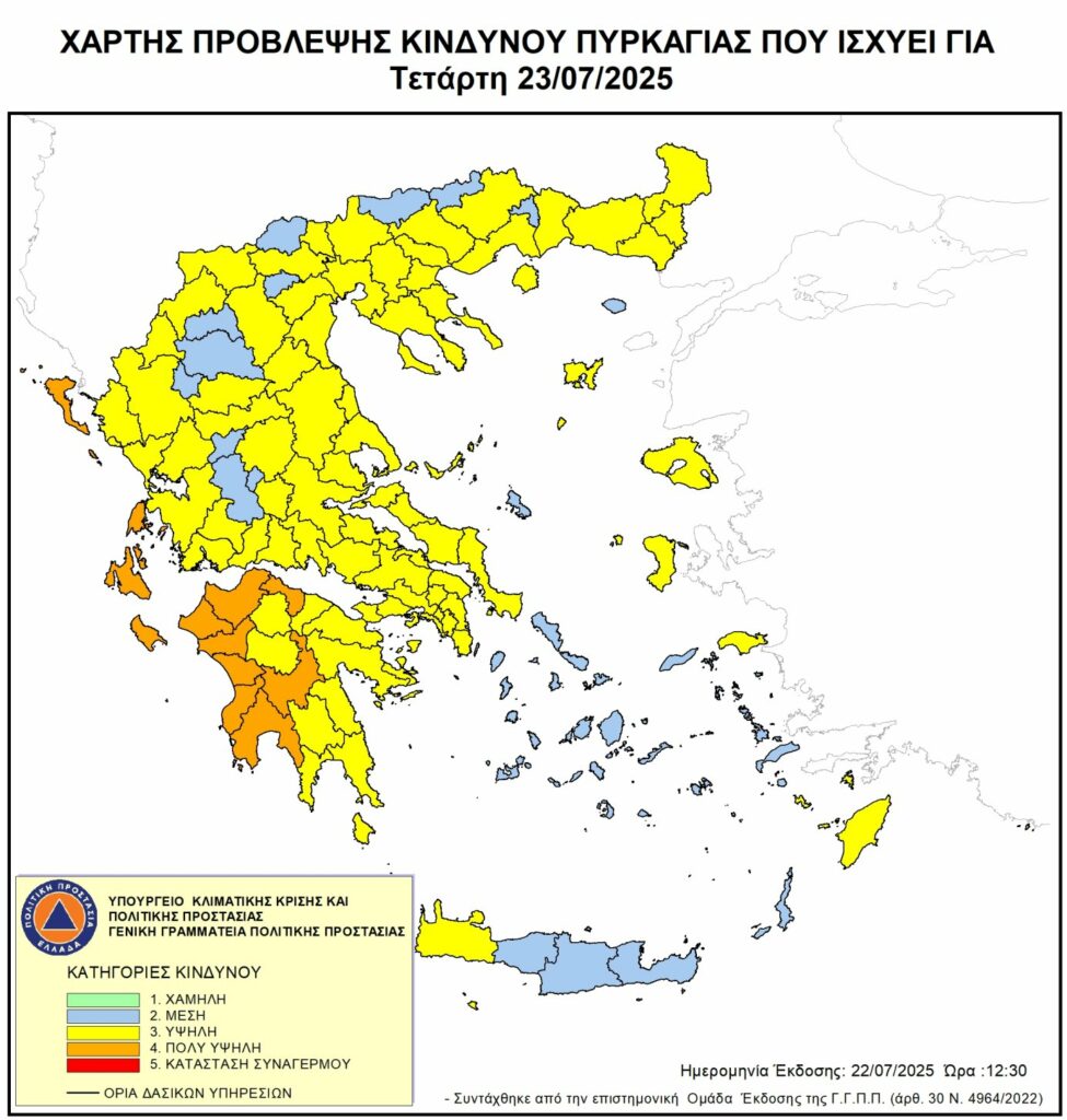 Σε κατάσταση κινητοποίησης (Red code) η Γορτυνία για αύριο Τετάρτη, 23.07.2025. Πολύ Υψηλός Κίνδυνος Πυρκαγιών. (Κατηγορία 4)